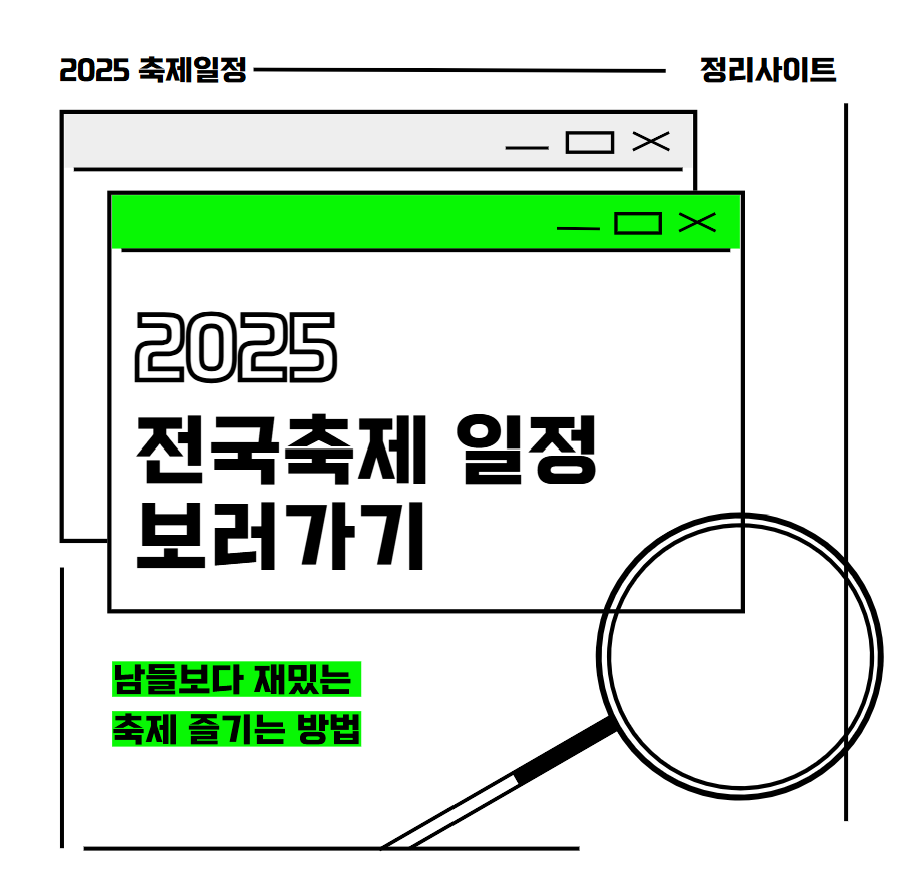 사이트1) 대한민국 구석구석https://korean.visitkorea.or.kr/kfes/list/wntyFstvlList.do 전국축제 | 대한민국 구석구석 축제전국 방방곡곡에서 열리는 축제 정보를 소개합니다. 전국의 다채로운 축제와 함께 행복하고 즐거운 여행 되세요!korean.visitkorea.or.kr:443  사이트2) 문화체육관광부에서 제공하는 축제정보 보러가기https://www.mcst.go.kr/kor/s_culture/festival/festivalList.jsp?pCurrentPage=5 지역축제 - 목록보기 | 문화체육관광부대관령눈꽃축제 30년 전, 대한민국 겨울의 중심 ‘대관령’의 청년 여럿이 모여 눈꽃축제를 만들었다. 1993년 시작된 ‘대관령눈꽃축제’는 전국에서 가장 먼저..